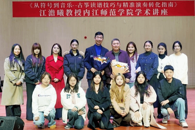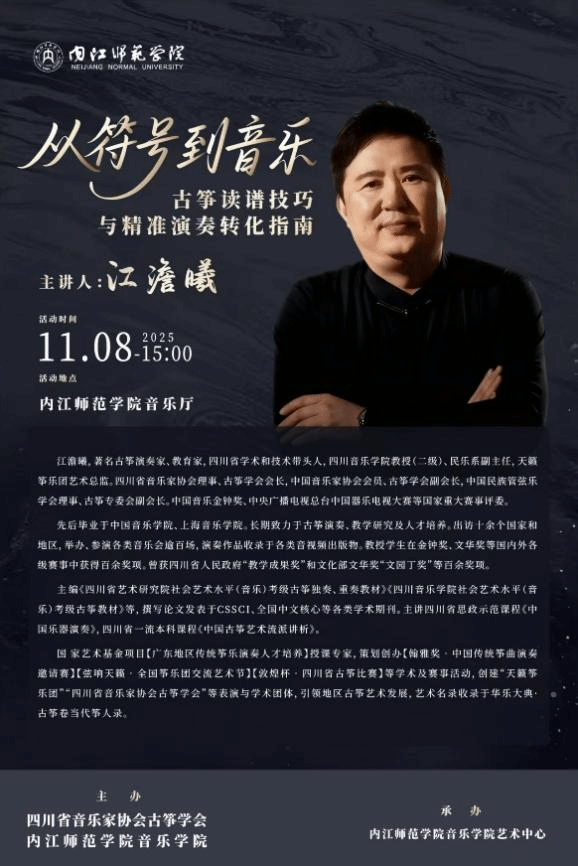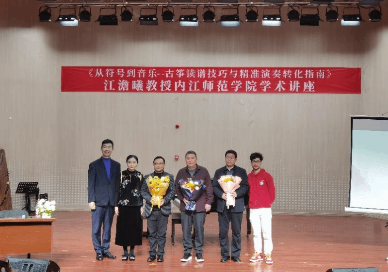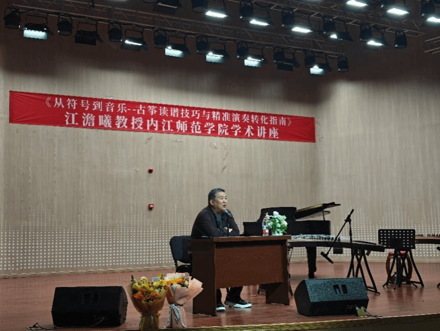 11月8日下午,中国音乐家协会古筝学会副会长、四川省学术和技术带头人、四川音乐学院江澹曦二级教授应邀莅临我校,在内江师范学院音乐厅进办了题为《从符号到音乐:古筝读谱技巧与精准演奏转化指南》的高水平学术讲座。音乐学院党委书记齐永朝,党委副书记、院长罗剑,副院长邓川,及全体相关专业教师、相关方向学生到场聆听学术讲座,来自内江市的古筝艺术教育工作者、爱好者、习练学生及学生家长代表慕名到场。
