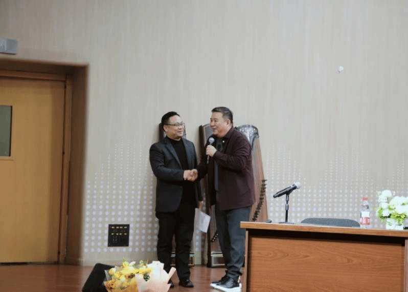 音乐学院罗剑院长作总结发言,他说:中国音乐金钟奖在蓉城刚刚落下帷幕,作为古筝专业评委,江澹曦教授带来了我省民族器乐专业选手“敲响金钟”的捷报,也为内江师范学院音乐学院的专业发展增添了新动力。他指出,江澹曦教授通过本次讲座为我们生动地诠释了“传承”的深度与广度。这份传承,不仅是将演奏技法毫无保留地传授给学生,培养出一批批优秀的专业艺术人才;更是以学者的严谨,通过主编教材、撰写论文、打造精品课程,为古筝艺术构建起系统的学术体系。江澹曦教授不仅是一位在台上闪耀的演奏家,更是一位在台下为整个行业“铺路搭桥”的引路人。