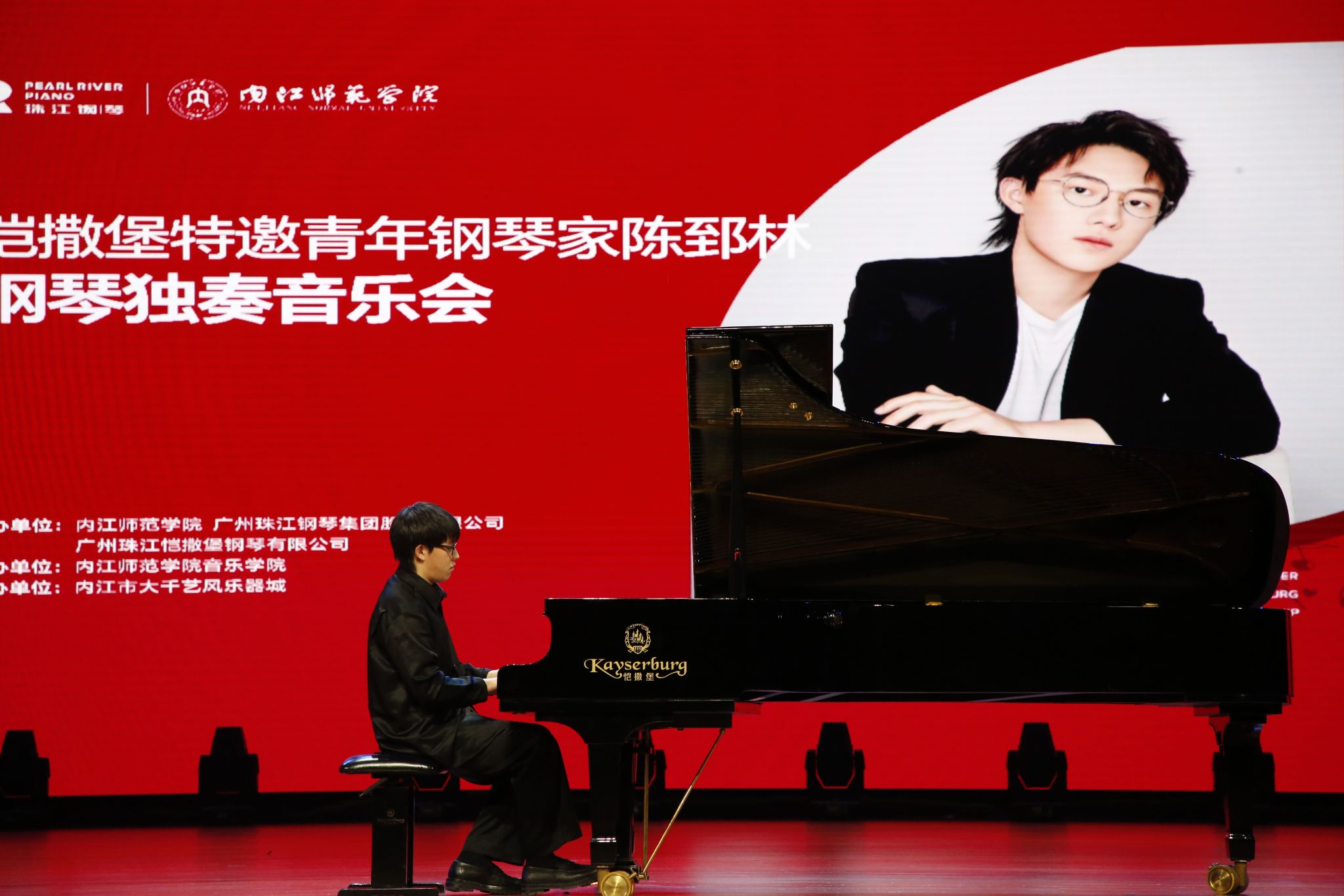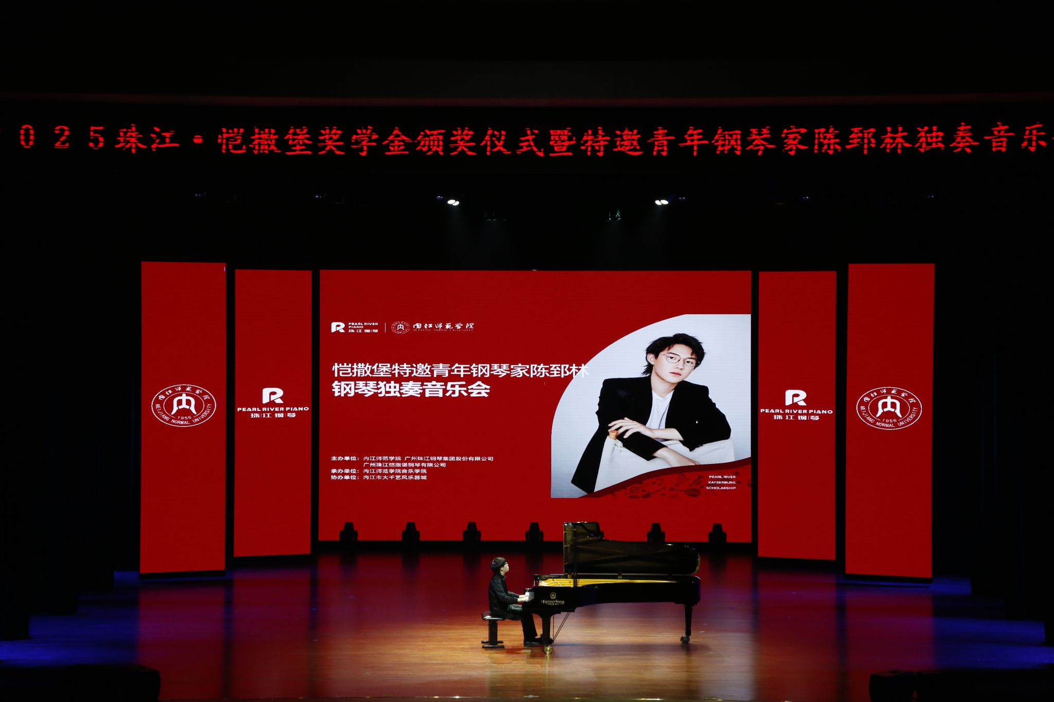 2025年12月18日下午14:00,备受瞩目的“珠江·恺撒堡奖学金”颁奖仪式在内江师范学院苌弘剧院隆重举行。仪式过后,珠江钢琴集团特邀青年钢琴家陈郅林献上了一场精彩绝伦的独奏音乐会,为在场观众带来了一场高雅的艺术盛宴。两场活动前后承接,既是对音乐学子勤学精神的肯定与激励,也是一次面向公众的高水平艺术普及与熏陶。