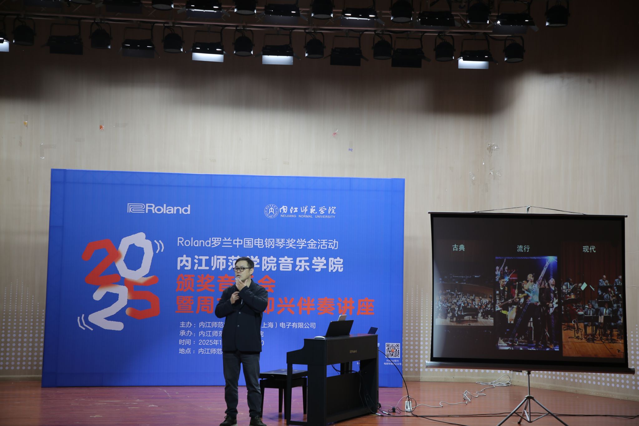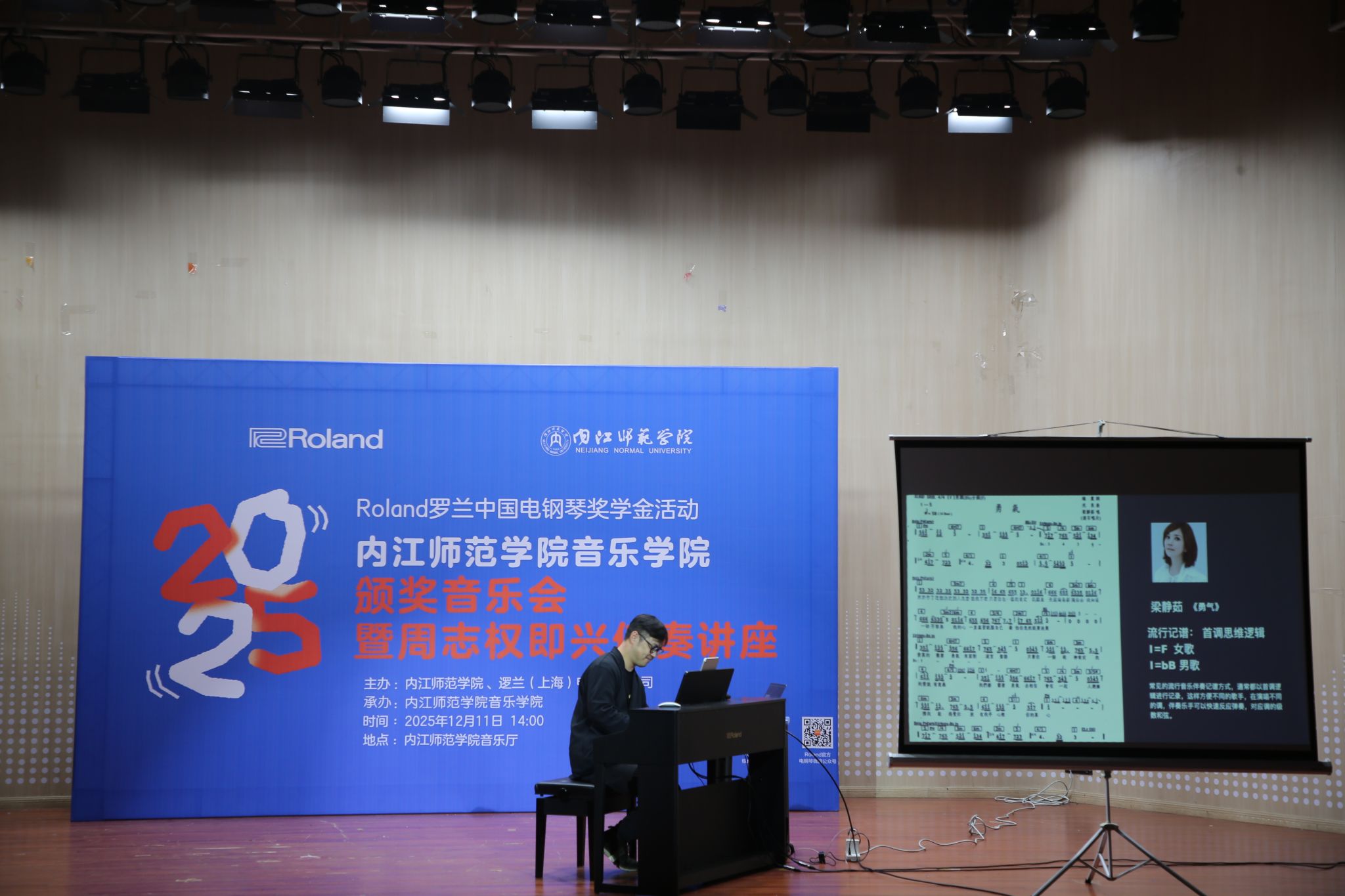 颁奖礼成后,学院特邀国际知名音乐设备品牌“逻兰”签约合作音乐人、青年演奏家周志权先生,为在场师生呈现了一场震撼的即兴伴奏专题讲座。周志权先生以深厚的演奏功底与活跃的创作思维,通过现场即兴演绎、互动问答与技法解析,生动阐释了即兴音乐在当代语境下的艺术价值与实践路径。讲座过程妙趣层出,启发性强,师生互动踊跃,艺术共鸣深刻。