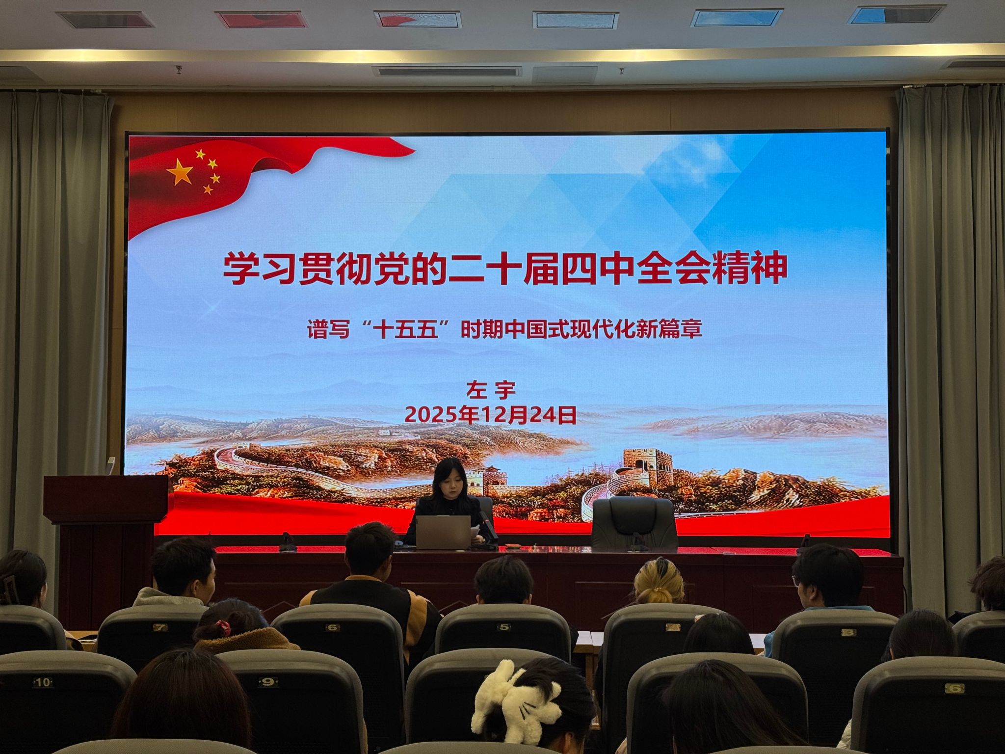 为深入学习贯彻党的二十届四中全会精神,引导青年学生深刻理解国家发展规划,2025年12月24日19:00校团委副书记左宇于小报告厅为所联系的音乐学院音23.4班开展了一场题为“学习贯彻党的二十届四中全会精神 谱写‘十五五’时期中国式现代化新篇章”的专题讲座。