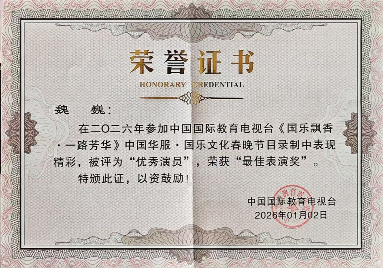 我院魏巍副教授予今年年初受邀在北京星光影视园参与了中国国际教育电视台(CECTV)《国乐飘香•一路芳华》“华服国乐春晚”的录制工作,用独特的跨界表达,向世界展现中华国乐的艺术魅力。这是魏巍副教授第二次登上该舞台,他与来自沈阳音乐学院的提琴演奏家詹宁副教授等艺术家联袂演绎了跨界新民乐作品《刀剑如梦》,凭借精湛的演奏技艺与极具感染力的舞台表现荣获本次活动“优秀演员”及“最佳舞台表演奖”双项殊荣,为学院赢得了荣誉。