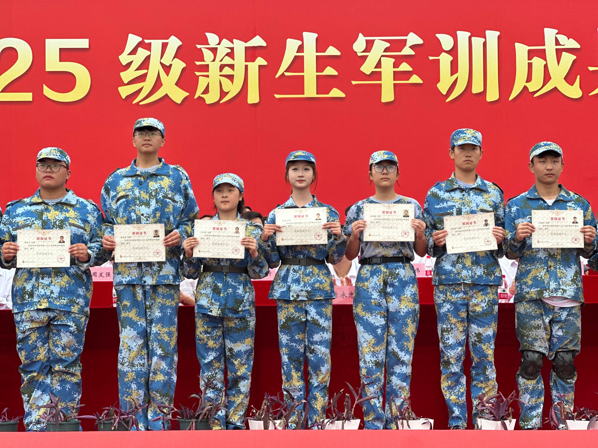 在表彰环节中,学院全体新生凭借优异表现及扎实到位的组织保障工作,成功斩获“先进营”“先进连”两项集体荣誉;个人表彰方面,学院共有29名新生荣获“军训先进个人”称号,其中2025级6班的何晴同学作为代表上台领奖。她训练态度端正、主动协助同学、各项考核表现突出,是全体获奖同学的优秀缩影。集体与个人荣誉的双重收获,是对学院全体新生军训成果的充分肯定。
